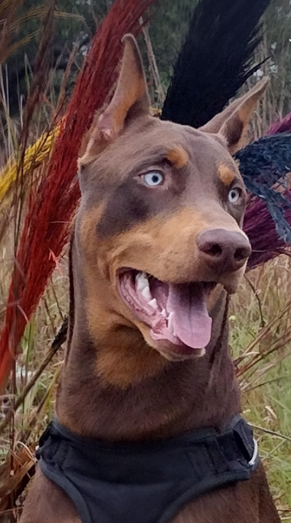 More: Ax'l is a red Doberman with a very unique trait. He's got ice blue eyes. It's extremely rare and he definitely stands out with that beautiful gaze. He's got a personality as beautiful as his eyes. He never meets a stranger and has a way of making everyone that meets him smile.
