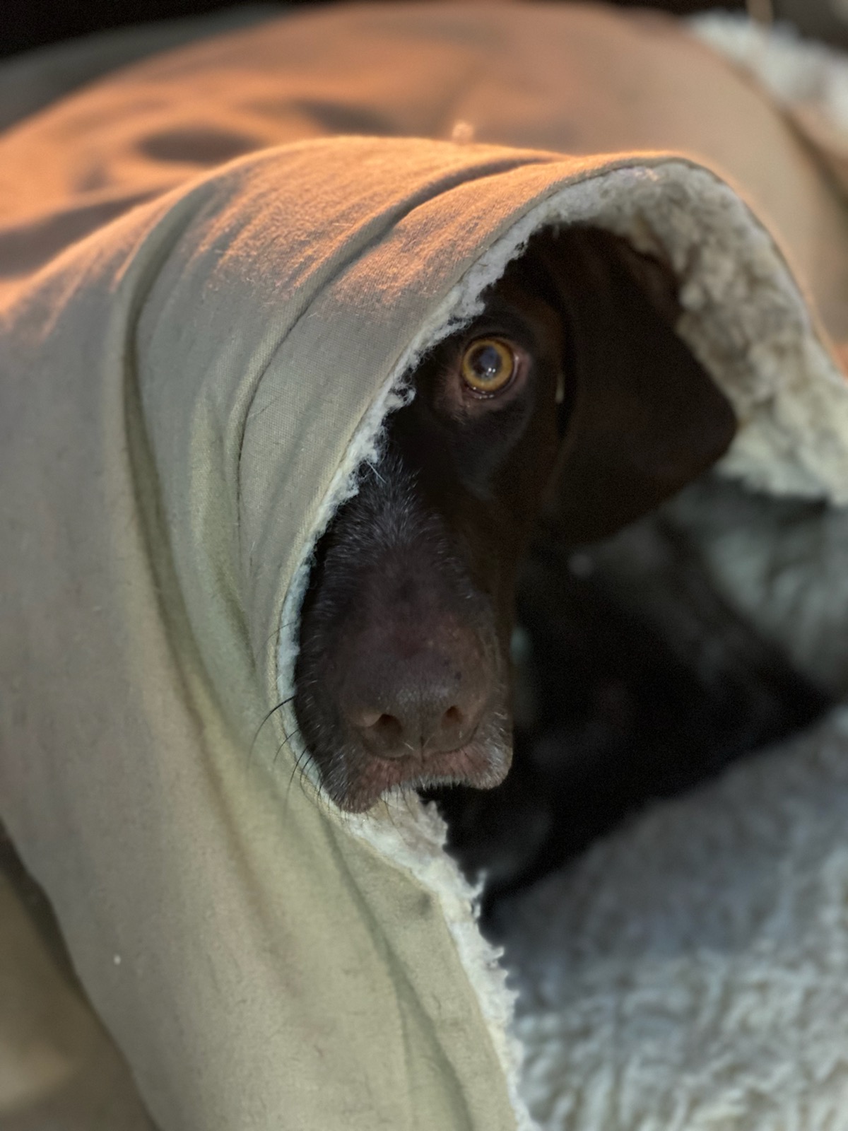 More: Berta is a slick, German wirehaired pointer. She is a fantastic hunting dog. She hunts ducks and points and retrieves pheasants, grouse and quail. After a long day of hunting, she likes to crawl into her cozy cave and warm up. This picture was taken after a long day of Minnesota cold weather pheasant hunting while she was sitting by the fire.
