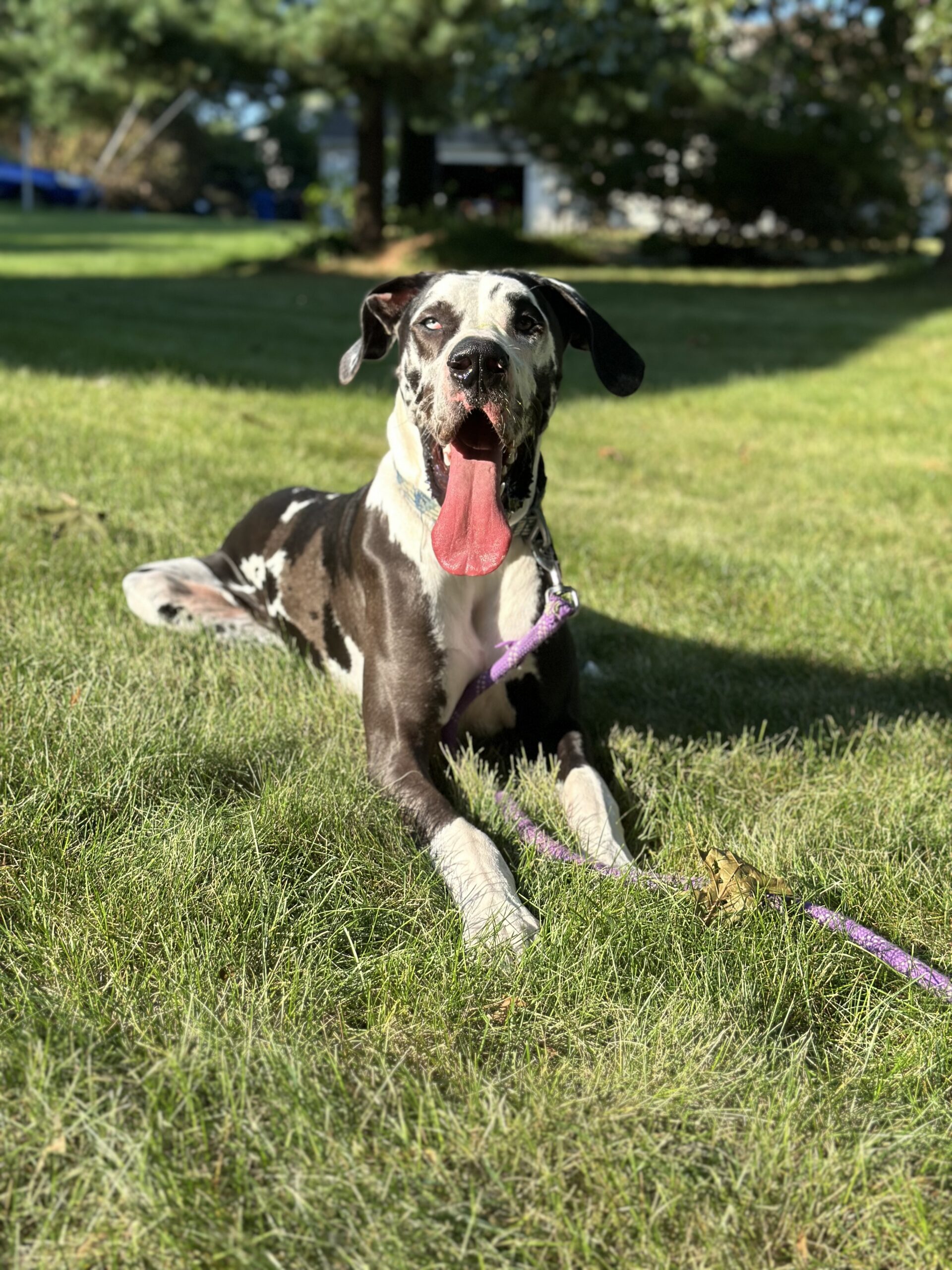 More: Bleu is a full harlequin Great Dane, he loves the outdoors from the summer sun to the snowy winter months. He loves butt rubs and people attention.