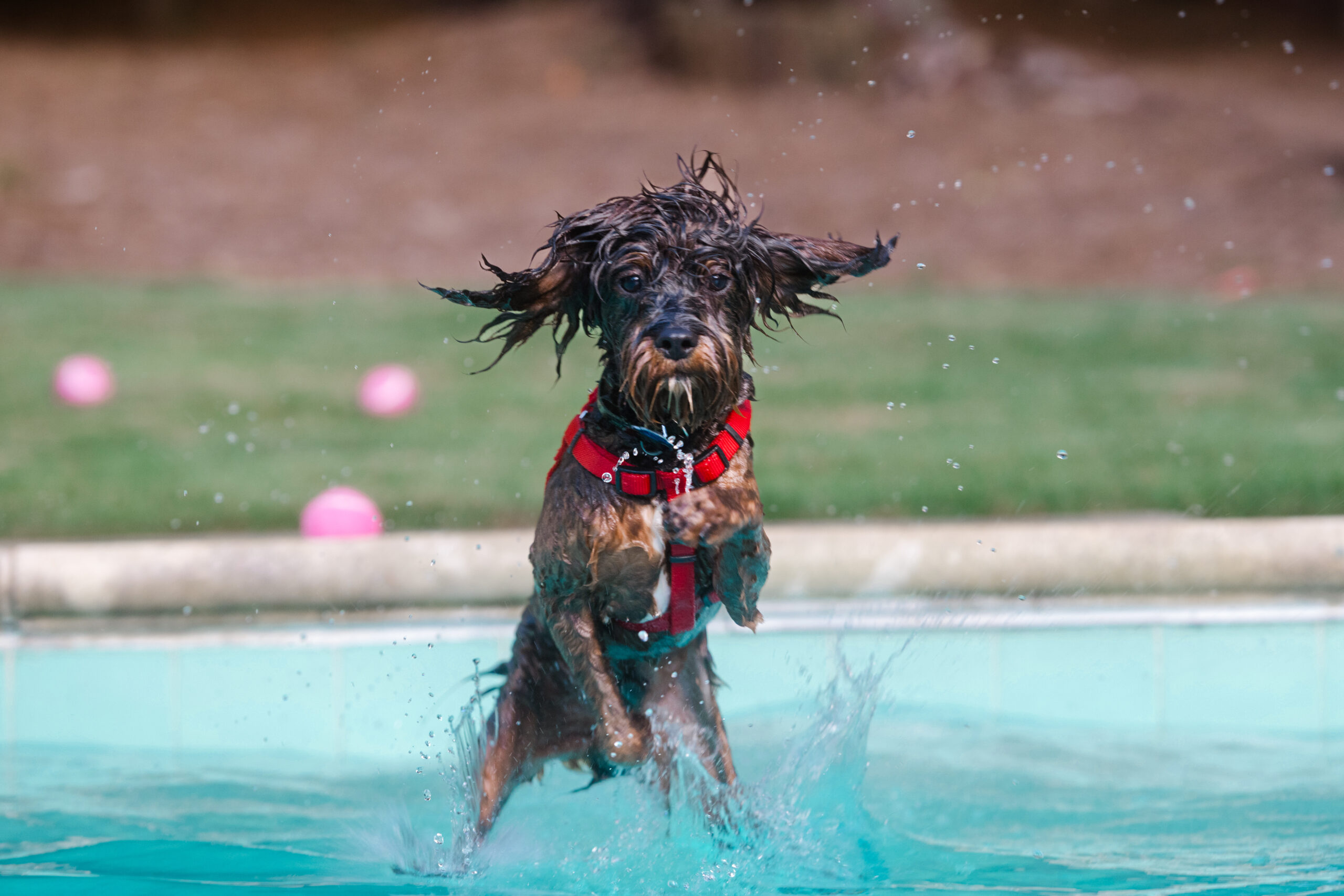 More: Georgie is our eight month old puppy who loves to go swimming! He swims laps for 40 mins plus without even touching the side. He is having the best summer ever swimming in the backyard pool. He even learned how to pull himself up out of the deep end like a pull-up. He loves to eat chicken and green beans. When he sees other dogs he doesnt sniff their butts but rather pets them like a human would pet a dog. He is a wildman!