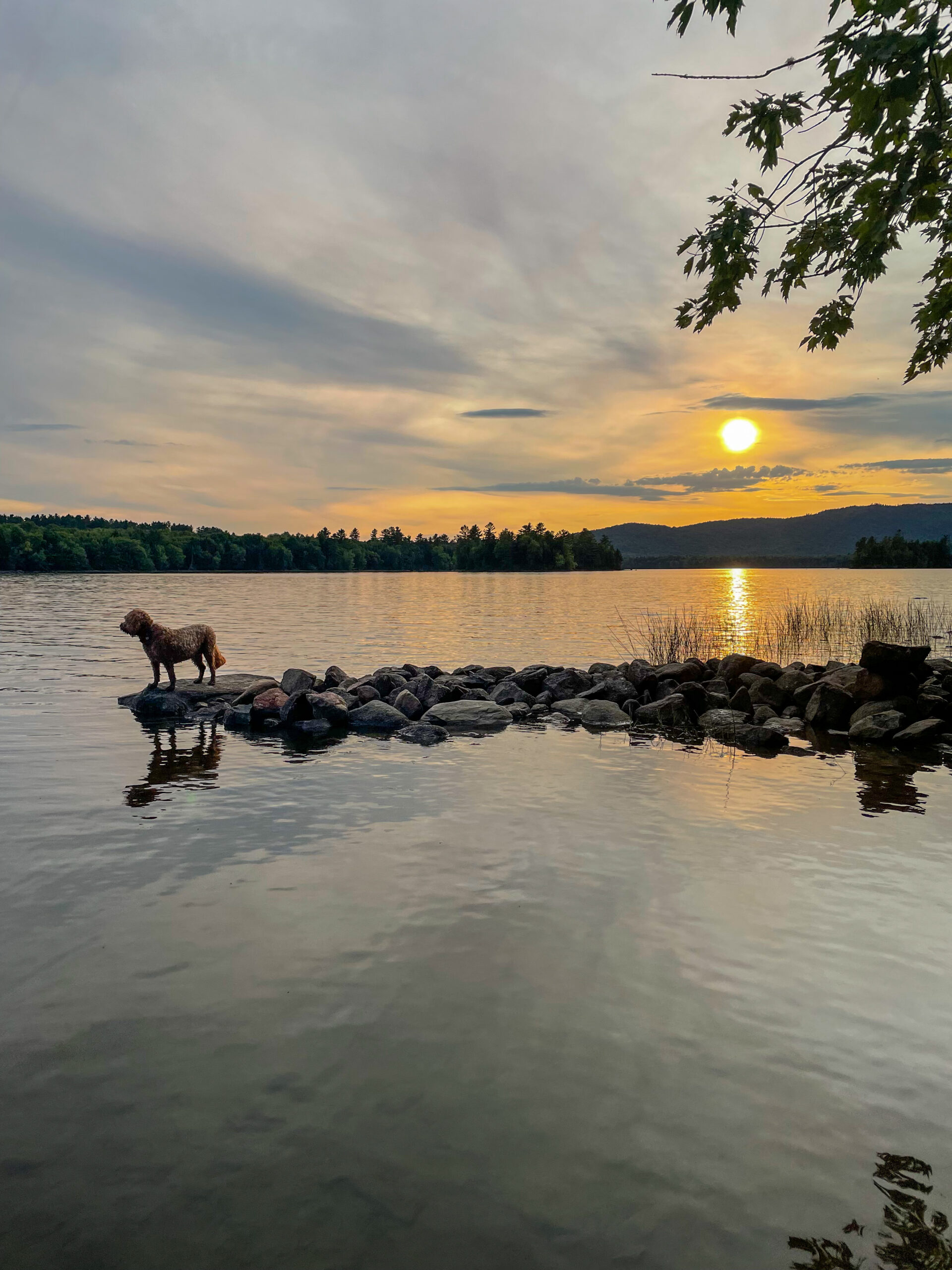 Millie the goldendoodle catches the sunset on a canoe camping trip in northern NH
