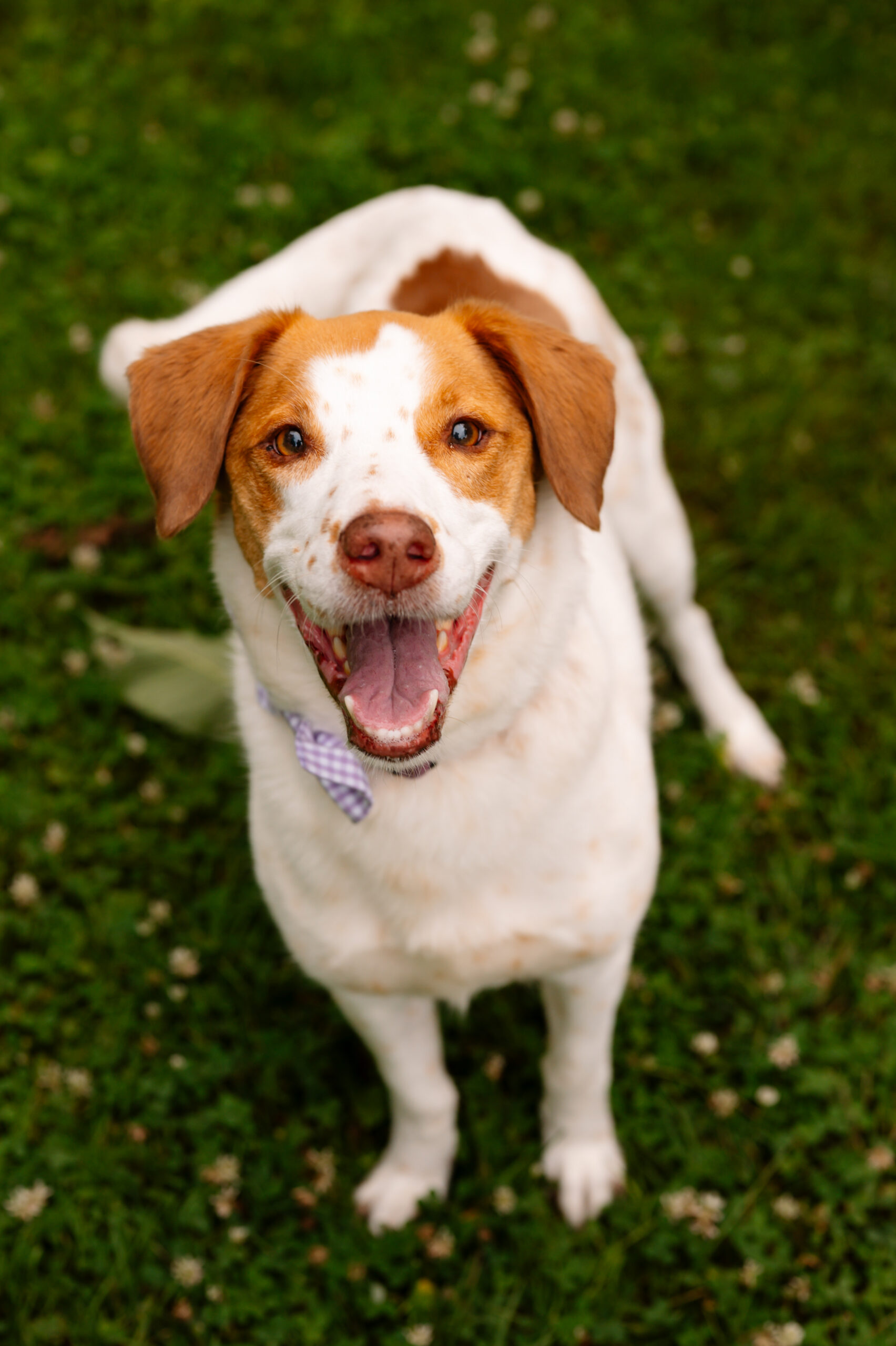 Olive, a Brittany spaniel pointer mix, who is mostly white with brown freckles, smiles at the camera wearing a purple checkered bow